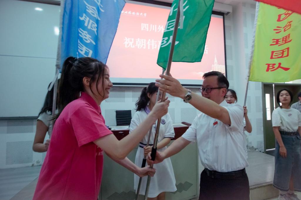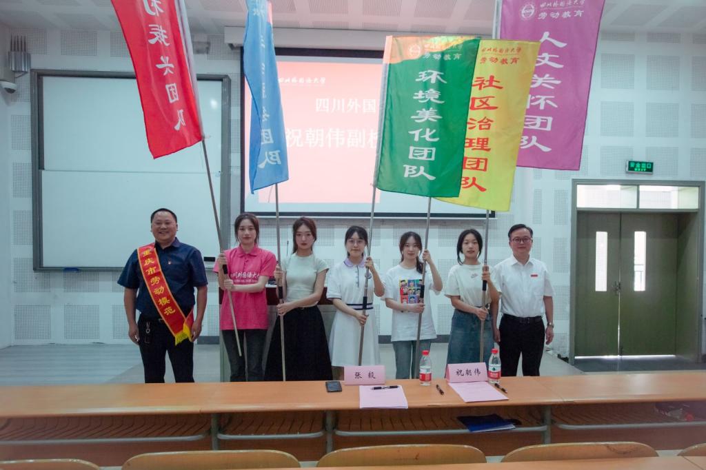最后,祝朝伟副校长宣布四川外国语大学劳动教育正式启动,并和重庆市劳动模范张毅共同为劳动教育社会治理、乡村振兴、社会服务、环境美化、人文关怀五个团队授旗。
