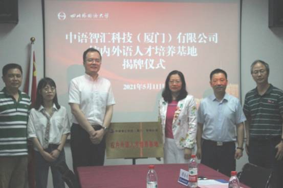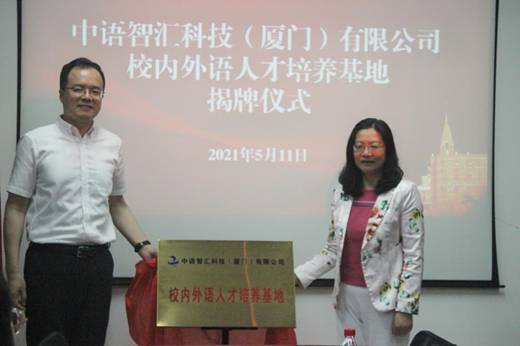 2021年5月11日上午,在立德楼B602会议室举行商务英语学院与中语智汇科技(厦门)有限公司共建“校内外语人才培养基地”揭牌仪式。商务英语学院院长段玲琍,党总支副书记常慧明,副院长顾金成、黄绍胜,中语智汇科技(厦门)有限公司总经理叶麟,销售经理林瑜婷及商务英语学院部分学生代表参加仪式。揭牌仪式由党总支副书记常慧明主持。