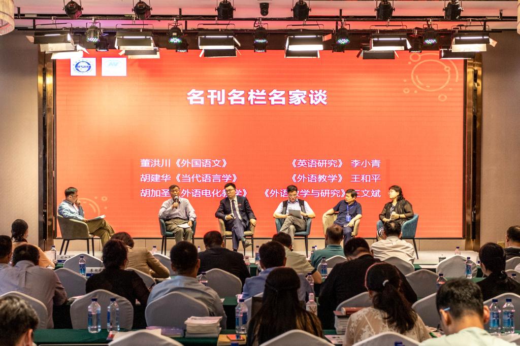 在“名刊名栏名家谈”主编论坛环节,《外国语文》《当代语言学》《英语研究》《外语教学》《外语教学与研究》等国内C刊的主编、副主编们围绕“什么是新文科外语?”“大数据如何引领外语学刊”等主题展开了讨论。该环节由《外语电化教学》常务副主编胡加圣教授主持。