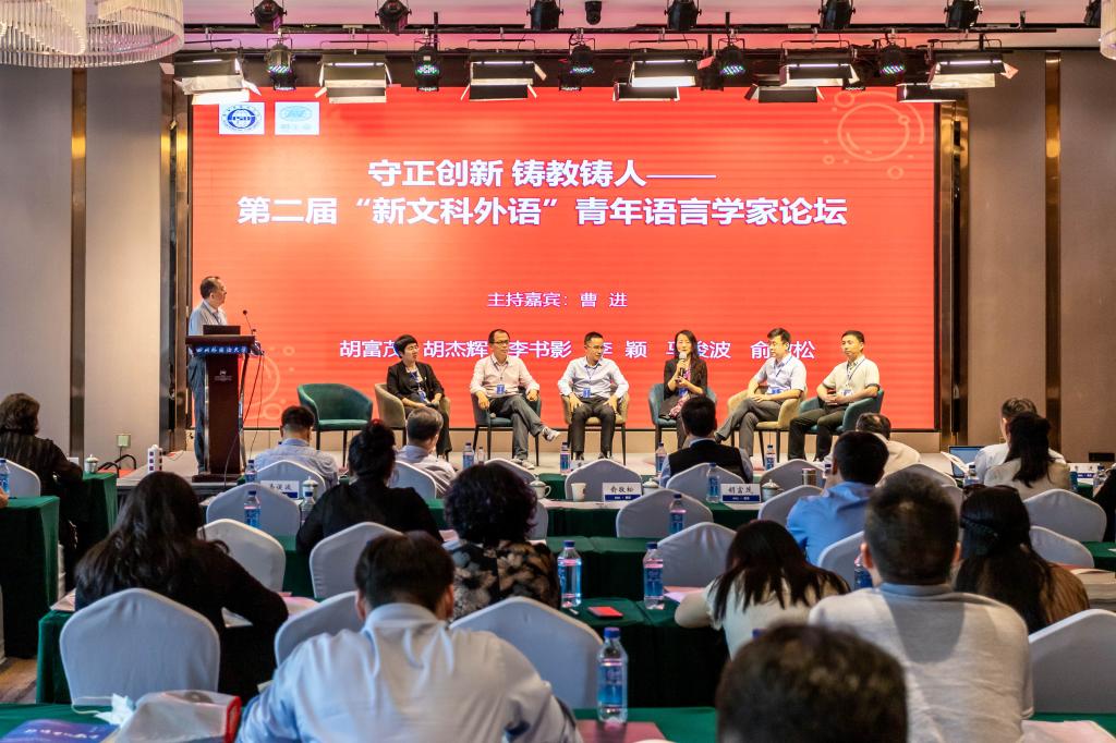本次会议开设了第二届“‘新文科外语’青年语言学家专题论坛”。淮北师范大学李书影、深圳职业技术学院马俊波、北京大学俞敬松、电子科技大学胡杰辉、洛阳理工学院胡富茂、杭州师范大学李颖等青年专家学者围绕“守正创新 铸教铸人”主题展开对话,该环节由西北师范大学曹进教授主持。