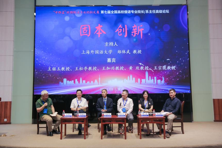 本次论坛还创新采用圆桌论坛的形式邀请知名专家进行主题研讨。圆桌论坛环节由上海外国语大学郑体武教授主持,王铭玉教授、王松亭教授、王加兴教授、黄玫教授、王宗琥教授担任圆桌论坛嘉宾,五位嘉宾围绕“固本、创新”主题以及新时期俄语专业建设如何回应外语语言学科五大方向的问题进行了精彩讨论。