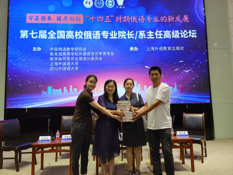 圆桌论坛后,安徽师范大学外国语学院俄语系安岩、邱静娟、王新三位老师向川外俄语学院赠送了著名翻译家力冈先生译文全集共19卷23册。