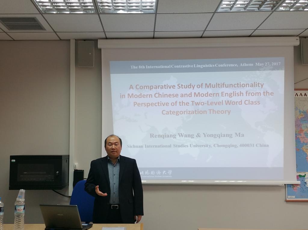 2017年5月25日至28日,“第8届国际对比语言学研讨会”(ICLC-8)在希腊雅典大学成功举行,来自20多个国家的120多位专家学者参加了本次会议。本次会议共邀请来自5个国家的5位知名学者做大会主旨发言,学术研讨分成4个论坛进行,共84场次。我校博士生导师、研究生院院长、学科办主任兼词典学研究所所长王仁强教授应邀出席本次研讨会,并于当地时间5月27日上午以“A Comparative Study of Multifunctionality in Modern Chinese and Modern English from the Perspective of Two-level Word Class Categorization Theory”(从双层词类范畴化理论看现代汉语和现代英语中的兼类现象)为题进行了交流发言。大会组委会主席、希腊雅典大学Giannoula Giannoulopoulou教授主持交流会。