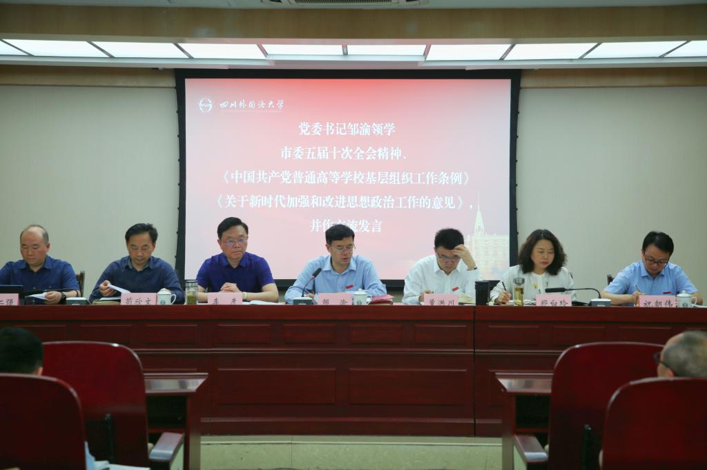 邹渝领学“市委五届十次全会精神”、《中国共产党普通高等学校基层组织工作条例》及《关于新时代加强和改进思想政治工作的意见》相关内容并作交流发言。他指出,科技创新是时代所需,重庆正在书写高质量发展的新篇章,对科技创新需求迫切,并从主动力、主目标、主方向、主战场、主平台、主抓手、主任务七个方面诠释重庆科技发展的方向。他强调,《条例》更加强调了党的全面领导,要求高校做到“为党育人、为国育才”;《意见》则强调要加强高校的思想政治教育,做到“哪里有党组织,哪里就有思想政治工作”。