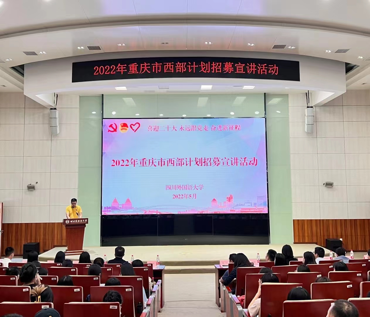 5月6日下午,2022年重庆市西部计划招募宣讲活动在我校宏文楼国际报告厅举行。重庆团市委、重庆市西部计划项目办联合11个服务区县西部计划项目办及部分在岗优秀西部计划志愿者代表走进四川外国语大学,开展2022年重庆市西部计划招募宣讲活动。我校数百名应届大学毕业生通过线上线下渠道参加活动。