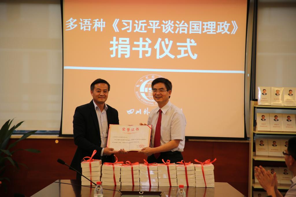 捐赠仪式上,李克勇对为我校捐赠图书的北京崇学文化发展有限公司的余富文先生表示衷心感谢,并为其颁发了捐赠证书。他表示,川外作为一所特色鲜明的多语种外国语大学,近年来着力构建具有外语院校特色的思政工作体系,《习近平谈治国理政》多语种图书是学校师生将学习活动与专业发展相结合的重要学习资源,我校将以本次捐赠为重要契机,认真组织学校师生认真学习研读习近平总书记的系列讲话精神,深化“两学一做”学习教育,从而推动川外师生研习中外语言文化、服务国家对外交往、服务地方经济方面取得更大的成绩。
