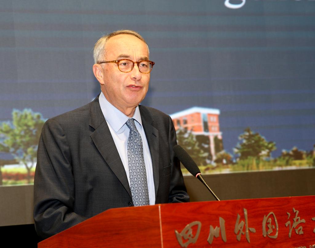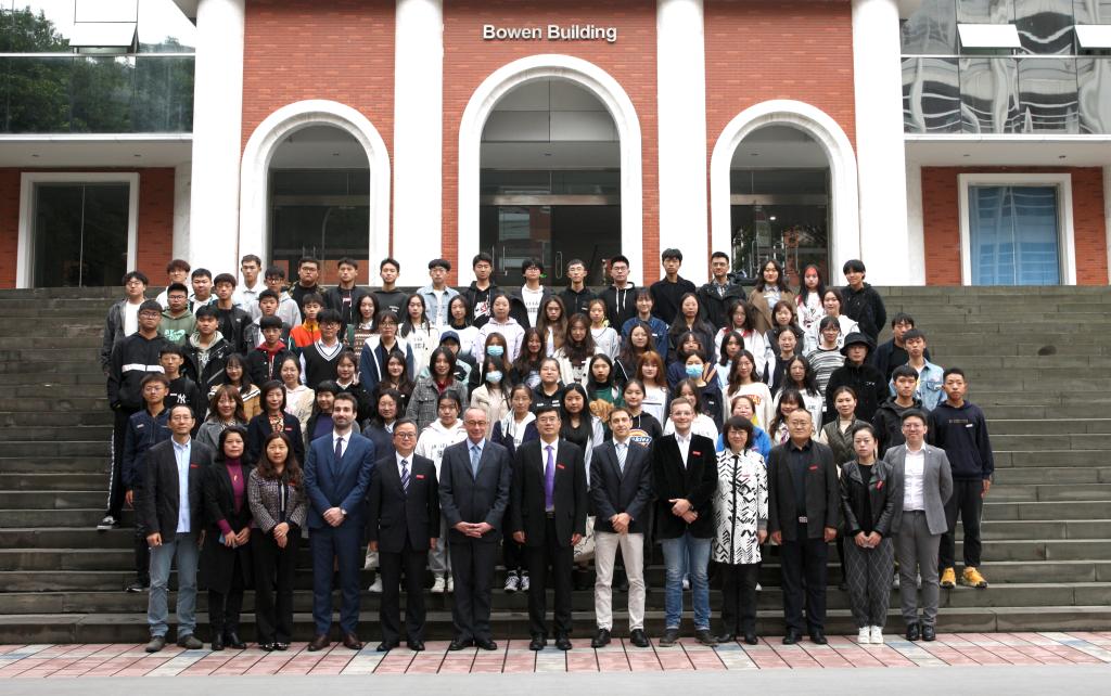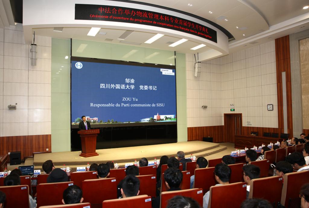 2021年10月19日下午,法国驻成都总领事白屿淞(Bruno BISSON)一行应邀出席我校与法国斯特拉斯堡大学合作举办物流管理专业合作办学项目首届学生开学典礼。我校党委书记邹渝、副校长祝朝伟接待来宾,国际合作与交流处、教务处、学工部、国际学院负责人及全体项目师生参加了典礼。