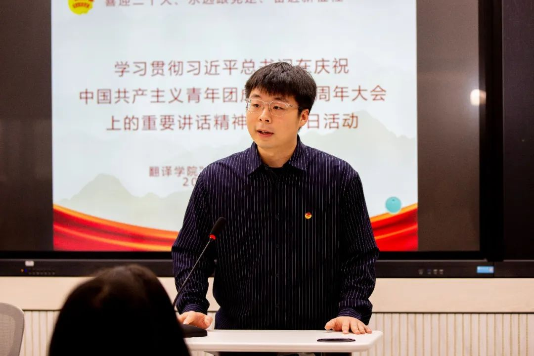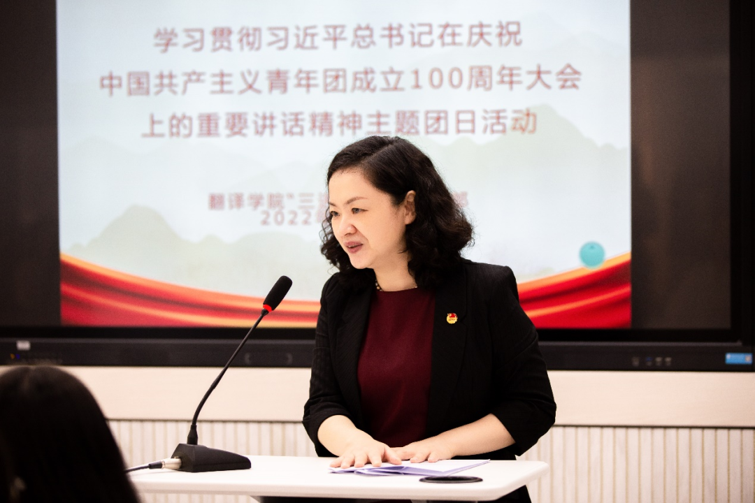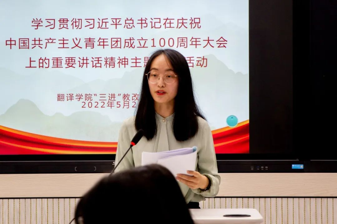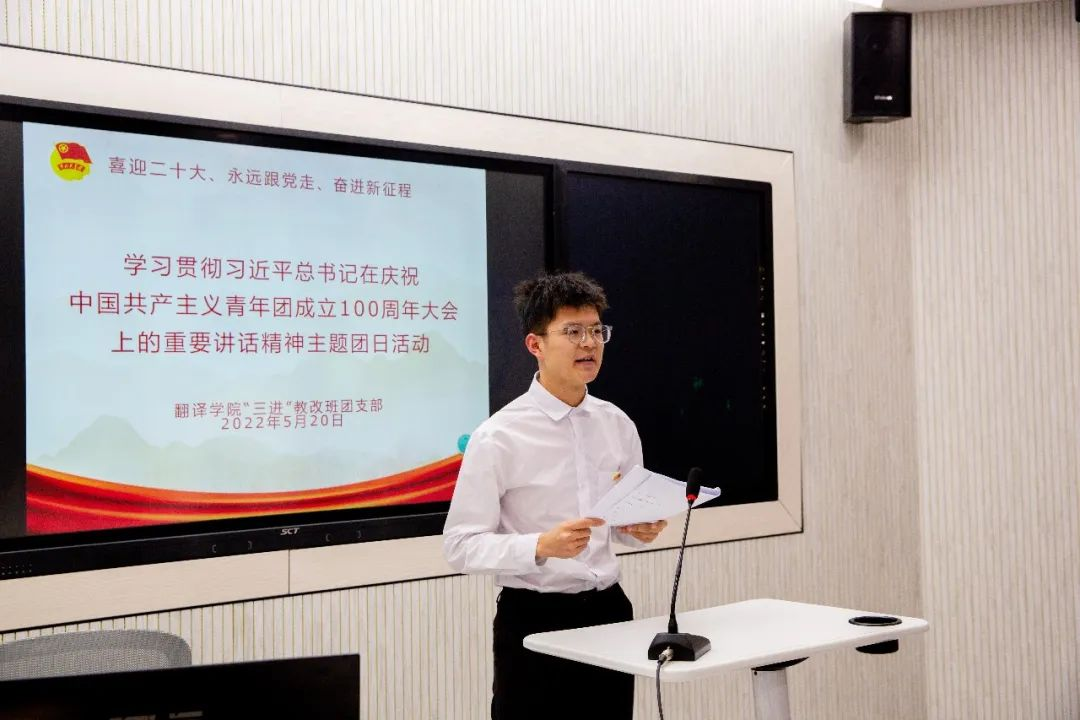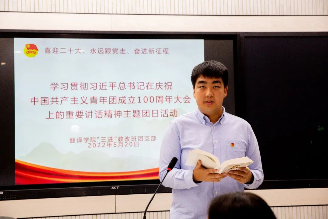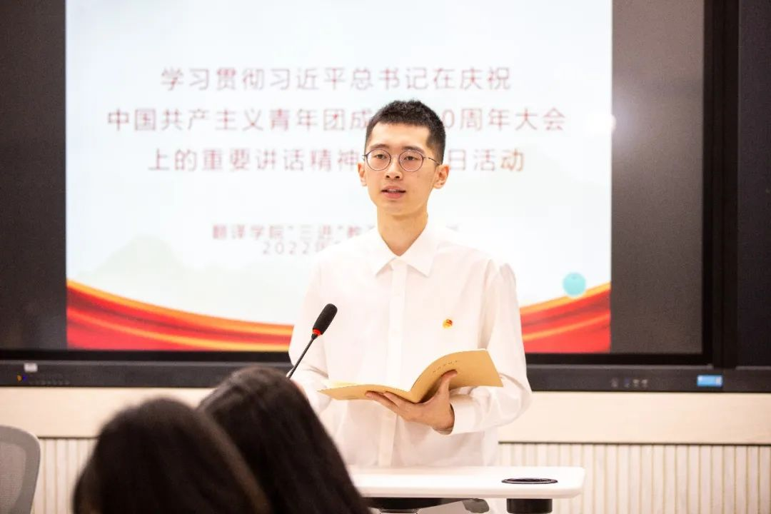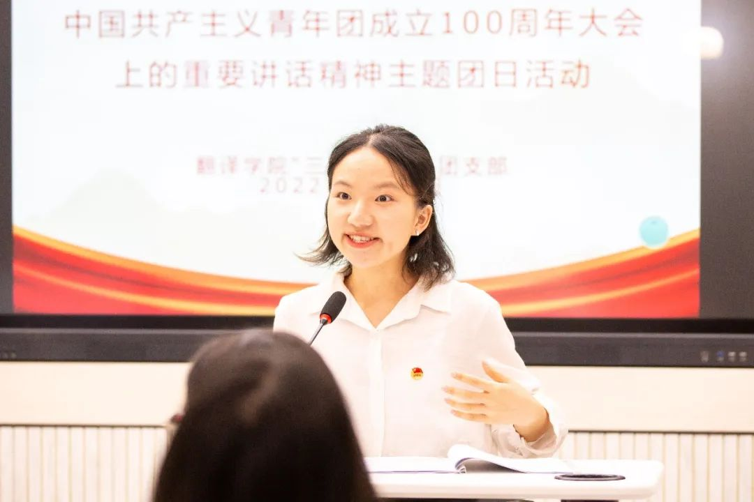 在主题团日活动上,同学们深情诵读《习近平谈治国理政》(第三卷)(英文版)和习近平总书记在庆祝中国共产主义青年团成立100周年大会上的重要讲话(英文版)金句选段,深入交流学习总书记重要讲话精神的心得体会,深度分享参加多语言赛会志愿服务的实践感悟,特别是深刻分析如何准确翻译总书记重要讲话中“国家之魂”“后生可畏”等引经据典内容,把总书记赋予典故鲜活的时代内涵精准翻译出来。