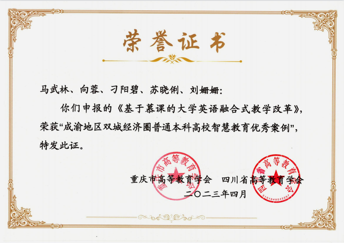 在4月8日高博会举行的“第七届中国高等教育智慧教学与课堂教学改革论坛”上,进行了成渝地区双城经济圈高校智慧教育典型案例及研究成果的发布和颁奖。由我校马武林教授牵头申报的《基于慕课的大学英语融合式教学改革》教学案例,经专家评选荣获“成渝地区双城经济圈普通本科高校智慧教育案例”,该案例是我校信息技术与大学英语课程深度融合的集中体现,案例较为详细地展示了学校积极落实教育数字化转型。
