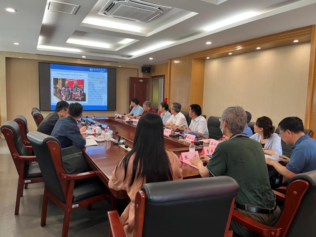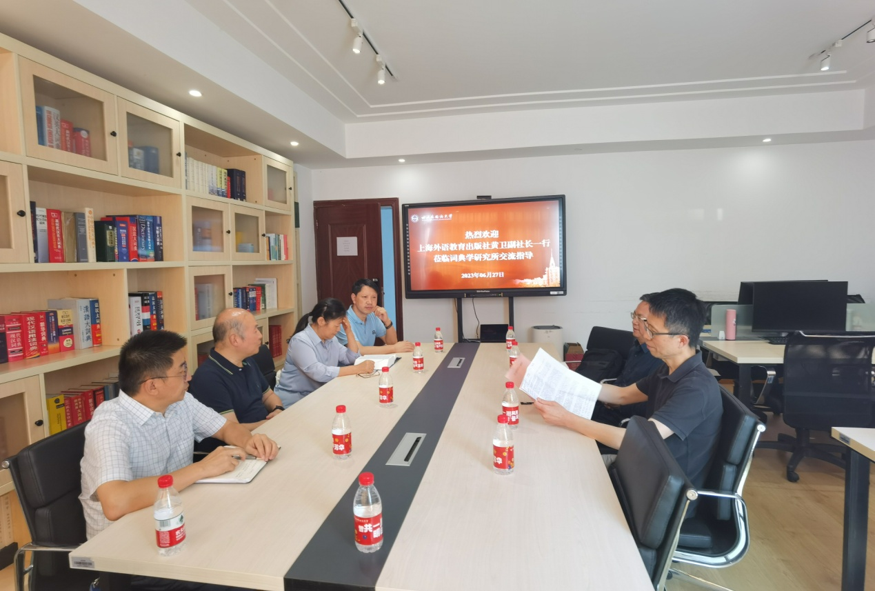 王伟对上海外语教育出版社副社长黄卫一行表示热烈欢迎,并依次介绍本次会议的参会人员。胡文飞院长从发展历史、团队成员、科研成果、学术交流、人才培养等方面介绍词典学研究所的基本情况。