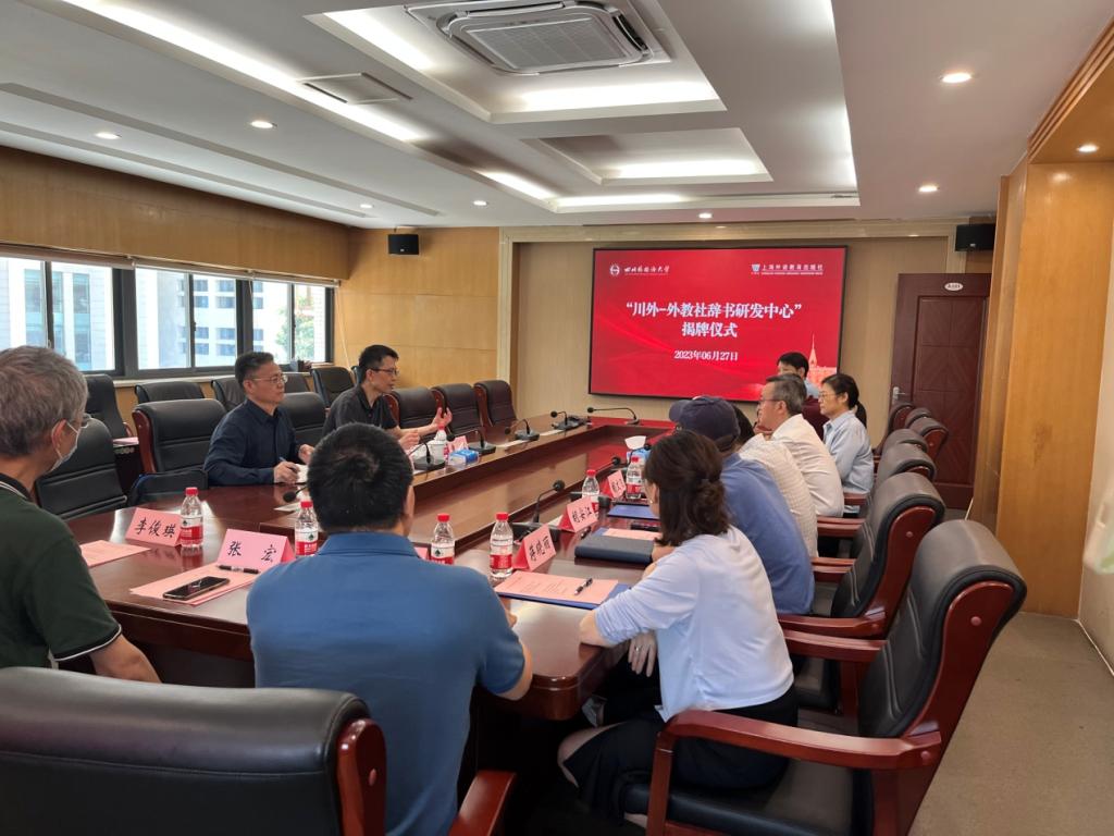 6月27日下午,“川外-外教社辞书研发中心”揭牌仪式在立德楼A301隆重举行。上海外语教育出版社(简称“外教社”)副社长黄卫、辞书事业部主任张春明,四川外国语大学副校长祝朝伟、词典学研究所副所长赵翠莲、市级词典学研究生导师团队负责人/商务英语学院院长胡文飞,研究生院院长胡安江,科研处处长王伟,校地合作处处长蒋晓丽及词典学研究所部分专兼职研究人员参加了会议。会议由科研处处长王伟主持。