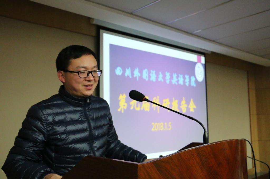 2018年1月5日下午3点至5点,英语学院在西区办公楼A609举办了成立以来的第九届年度科研报告会。副校长董洪川、学科办主任王仁强、科研处处长李小青与英语学院全体教职工,对2017年的科研工作进行了总结,并聆听了三场学术报告。报告会由英语学院院长张旭春主持。