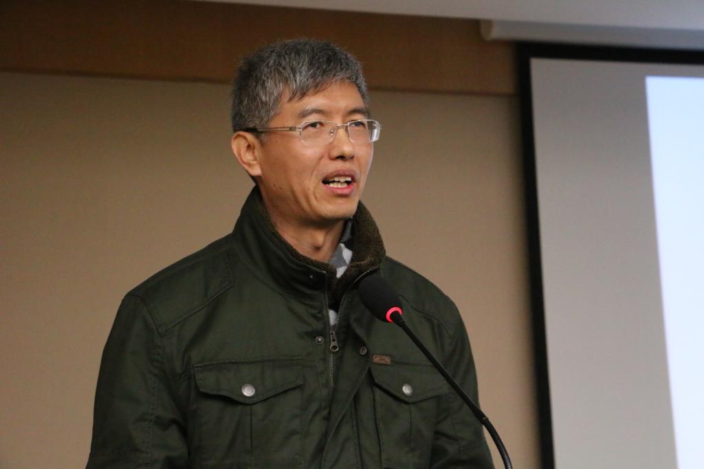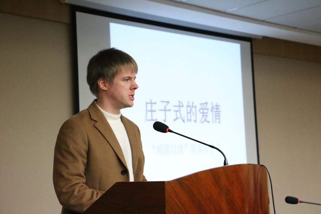 随后,外教Parker Walker(中文名:玄易风)作了报告,这是英语学院首次邀请外教担任科报会报告人。他从考证中国人对理想爱情的理解—“相濡以沫”开篇,引用庄子、孔子等原典,深入讨论了“庄子式的爱情”。玄易风汉语地道,语言风趣,谙熟经典,互动多样,赢得了阵阵掌声。随后,张宏教授在肯定玄易风观点的基础上,归纳了对庄子的不同理解,并且提出了继续深挖和拓展的方向和建议,鼓励玄易风钻研圣人的情感观,并且身体力行。