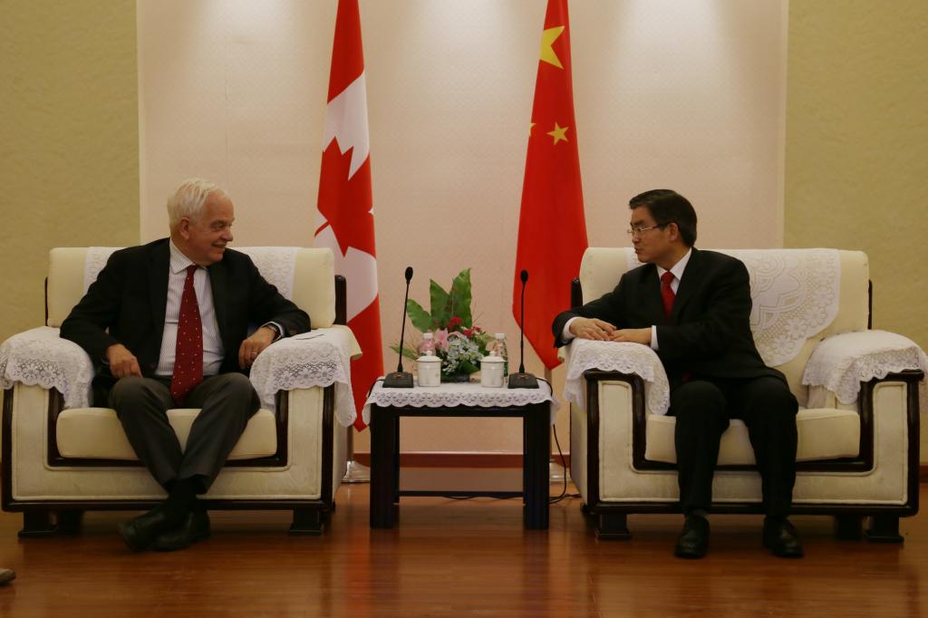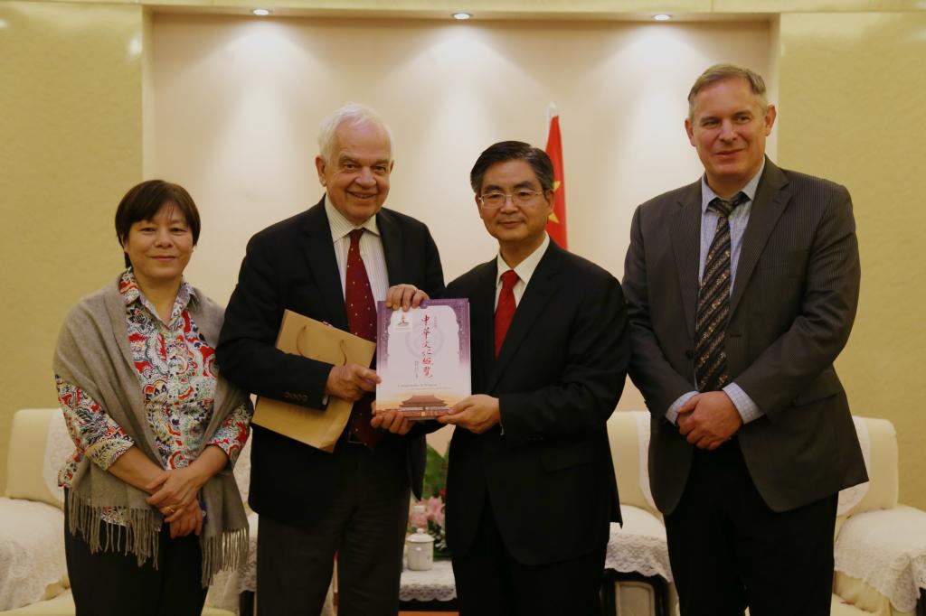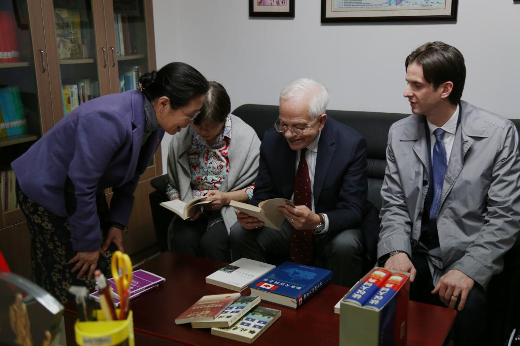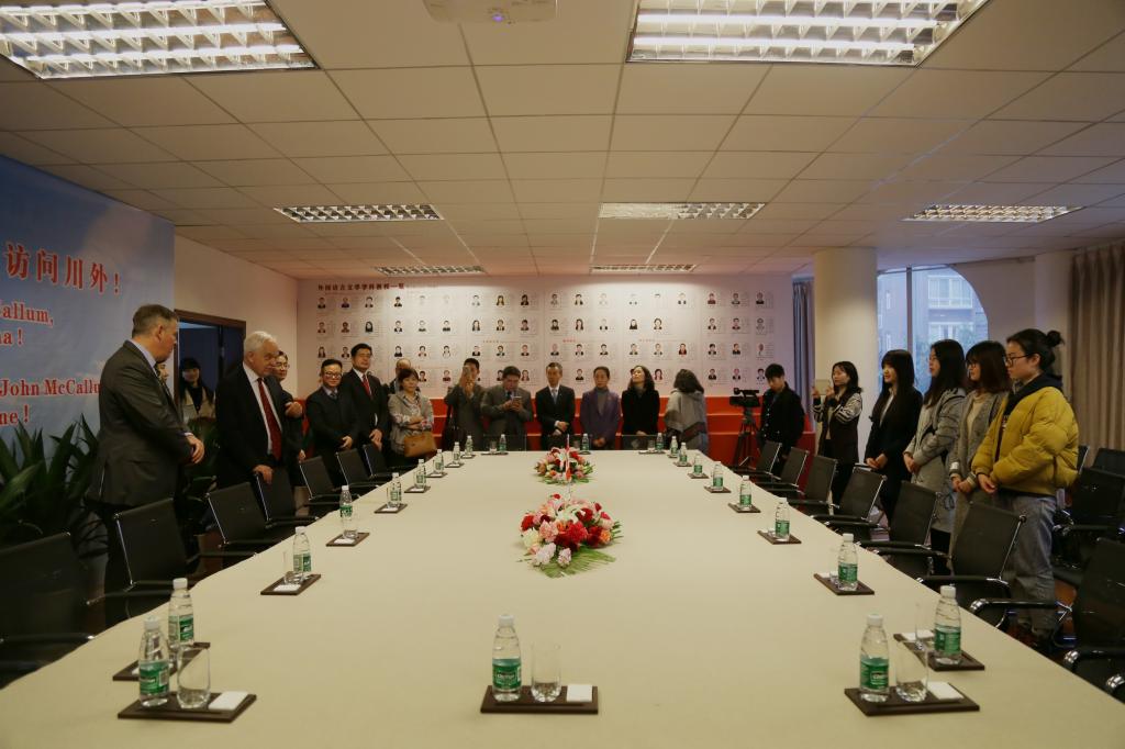 李克勇校长对来宾表示热烈欢迎,并介绍了我校的教学科研情况,回顾了我校与加拿大领馆和加拿大高校之间的合作交流。李校长告诉大使,川外是加拿大研究的发起者和发源地,《加拿大百科全书》以及有关魁北克研究的重要论著都出自川外的专家学者。大使听得饶有兴趣,并给予高度评价,表示今后将继续支持加拿大高校与我校的交流与合作。互赠礼物时,李校长将其主编的法文版《中华文化概览》作为礼物赠与麦家廉大使。会见完毕,麦家廉大使一行在校领导的带领下参观了我校加拿大研究中心。中心负责人向大使介绍了中心的发展历程及研究成果。并在人文社科基地会议室与师生表进行了短暂的交流。