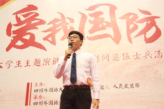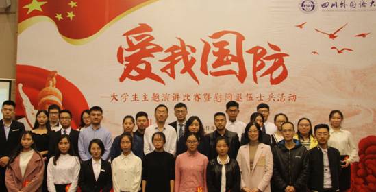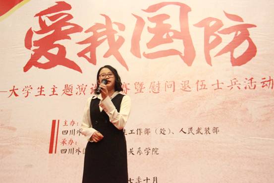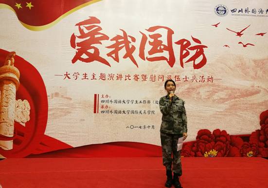 2017年10月23日下午2点30分,四川外国语大学“爱我国防”大学生主题演讲比赛暨慰问退伍大学生活动在东区宏文楼国际报告厅拉开帷幕。本次活动由四川外国语大学学生工作部(处)、人民武装部主办,国际关系学院承办。校党委常委、副校长兼党委组织部部长张季菁,学生工作部(处)部(处)长兼人民武装部部长吴维均、党委宣传统战部副部长熊鹰、学生工作部(处)副部(处)长兼人民武装部副部长苏雪、国际关系学院党总支副书记申安桂出席了活动,党委组织部干部科科长李铮、校团委姚诚与部分嘉宾担任了演讲比赛评委。