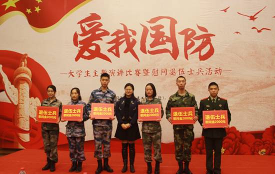 首先进行的是慰问退伍大学生活动。一直以来,我校积极开展国防教育和大学生应征入伍宣传教育活动,一部分学生积极响应祖国召唤,投笔从戎,参军入伍,把爱国之心化为报国之行,为广大川外青年树立了榜样。而回到校园后,他们又将军旅生活中不断向前、不惧困难的精神带到了生活和学习中,同样取得了骄人的成绩。我校2016年、2017年退伍复学的大学生们来到了现场。张季菁副校长慰问了退伍复学的学生们并为他们发放了慰问金。随后,退伍复学学生代表新闻传播学院2014级周澄同学上台发言,她讲述了自己参军的个人经历,让在场的师生们都深刻感受到了以她为代表的入伍大学生们把自己的知识、智慧、青春和热血献给祖国国防和军队建设的川外精神。一流的国防需要一流的军队,一流的军队需要一流的人才,大学生应征入伍成了这个时代青年历史使命感和时代责任感最清晰的缩影。特别是今年九月,习近平总书记回信勉励了南开大学新入伍的8名大学生,更激发了我们每一个川外青年崇军尚武的情怀和热爱祖国国防的政治热情。