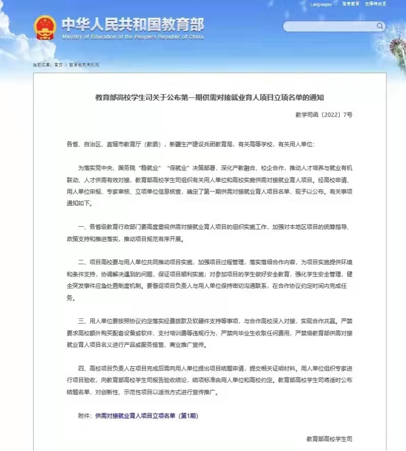 为促进高校毕业生更加充分更高质量就业,帮助用人单位培养和招聘更多实用型、复合型和紧缺型人才,推动培养就业有机联动、人才供需有效对接,教育部高校学生司实施了2021年供需对接就业育人项目。2022年4月6日,教育部公布了第一期供需对接就业育人项目立项名单,由国际工商管理学院王婷副书记牵头学工团队与领途教育咨询(北京)有限公司共建的就业实习基地项目正式获批立项。
