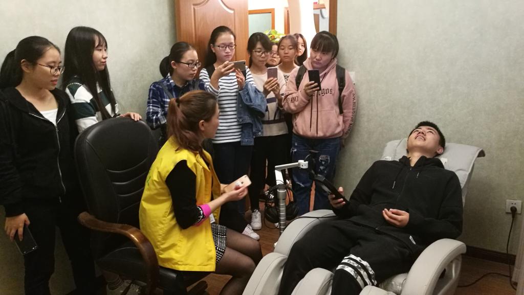 接下来,社工带领带领同学们参观了社工办公室以及心理测评室、沙盘活动室、家庭咨询室等功能室,并邀请同学体验了音乐放松室情绪舒缓设备,现场教学了设备的操作技巧。