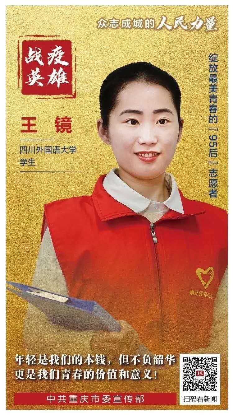 3月24日晚,在渝中、江北、南岸等地标建筑户外LED屏,展示着战“疫”英雄们的光影故事。其中,我校国际商学院王镜同学,她是绽放最美青春的“95”后志愿者。