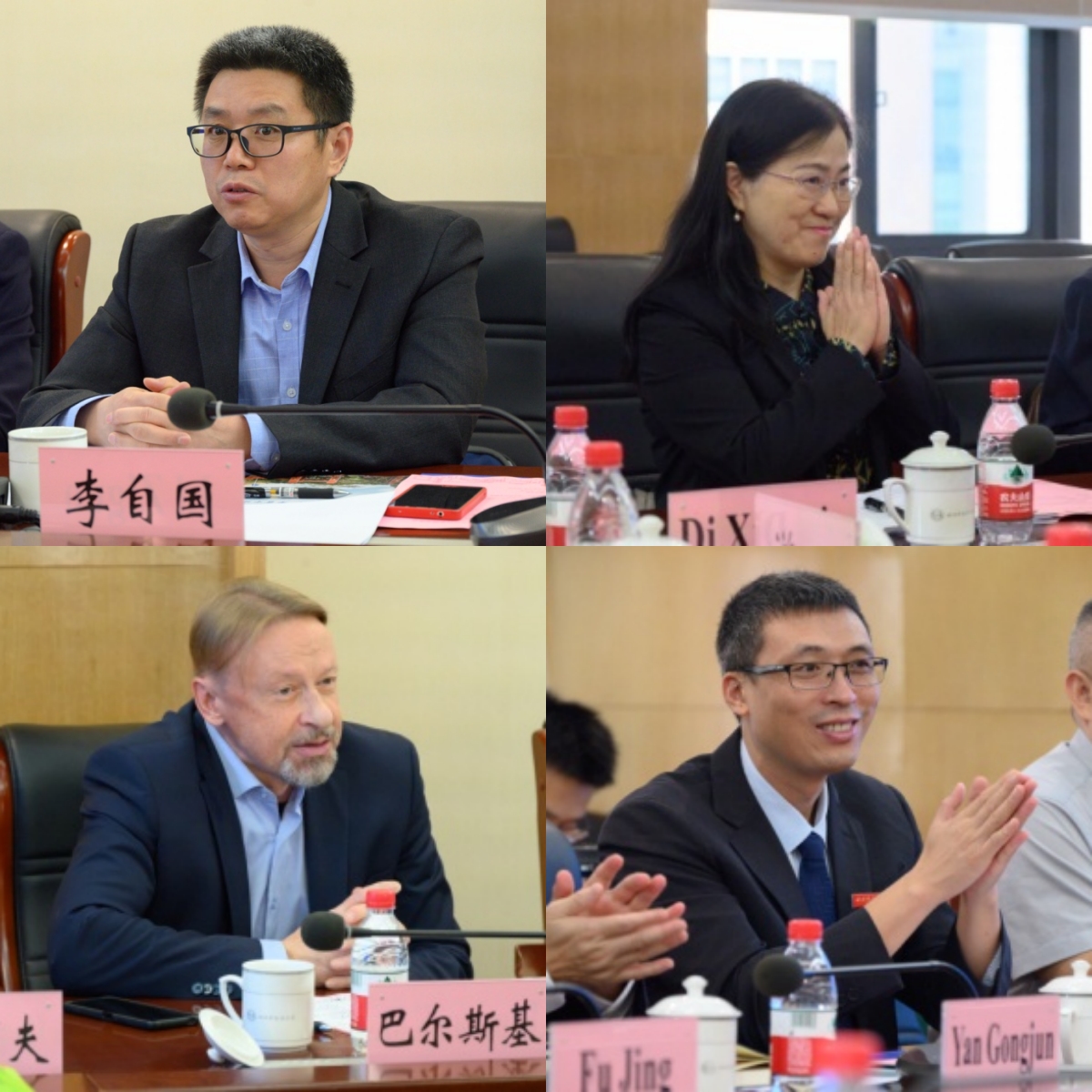 中国国际问题研究院欧亚所所长李自国、莫斯科国际关系学院外交教研室主任巴尔斯基、我校国际关系学院院长宋国华、俄语学院院长徐曼琳等参加座谈。