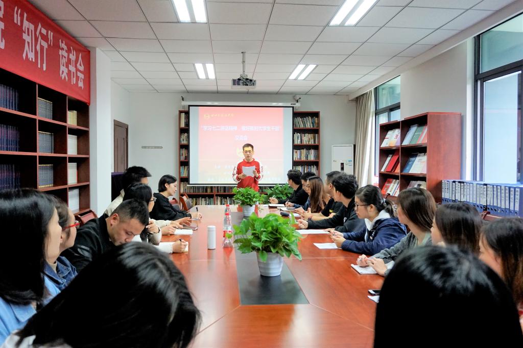 10月17日下午,由校团委、马克思主义学院主办的“学习习近平总书记‘7.2’重要讲话精神,做新时代学生干部”主题学习研讨活动在行政楼B503举行。活动由校习近平新时代中国特色社会主义思想研究学习社承办,马克思主义学院研究生、校青马工程优秀学员,指导教师彭雪容、冯波等共计20余人参加并分别在活动中交流发言。