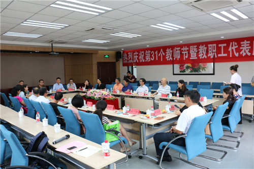 为庆祝第31个教师节,9月10日上午,我校于行政楼c517召开了职工代表座谈会。党委书记明国辉、校长李克勇、副校长王鲁男、副校长李小川、副校长郑白玲出席了此次会议。郑白玲副校长主持会议。本次会议旨在慰问奋斗在工作岗位一线的老师们,倾听老师对学校建设的意见和建议。参加会议的教职工,有从事教育工作30年的教职工代表、获得各级表彰奖励的教职工代表和中青年教学科研骨干教师代表。会议在轻松活跃的气氛中展开。