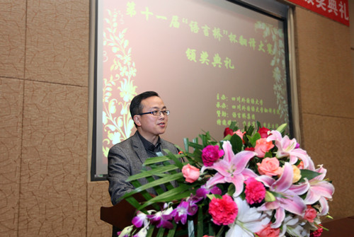 校翻译学院祝朝伟院长首先表达了对与会领导嘉宾的欢迎以及对获奖选手祝贺。他回顾了第十一届“语言桥”杯翻译大赛从国内外包括清华大学、浙江大学等优秀选手的825份稿件中筛选出最优秀译文的历程,并对朱宪超先生及语言桥集团、以胡安江教授为代表的高校专家评审团队等为“语言桥”杯翻译大赛倾注的心血表示感谢,同时,提出“语言桥”翻译大赛将在尊从忠实原文、文笔优美、富有创新等规则外不断改进形式吸引更多翻译人才。随后,朱宪超董事长全面讲解了“语言桥”的发展历程,并对广大学子提出了规划人生的忠告。最后,李小川副校长在讲话中对语言桥集团的支持表示感谢并宣布了5所获得组织奖的高校。