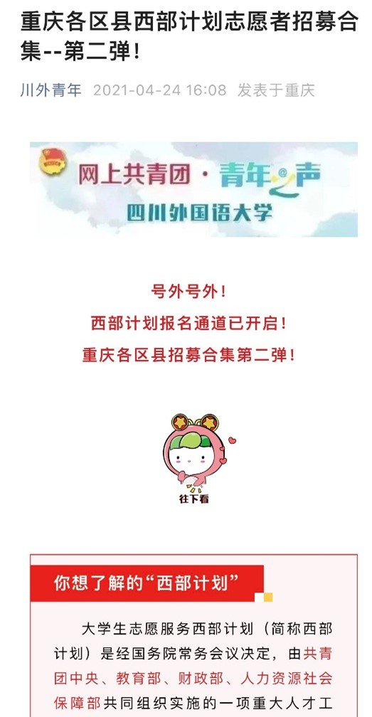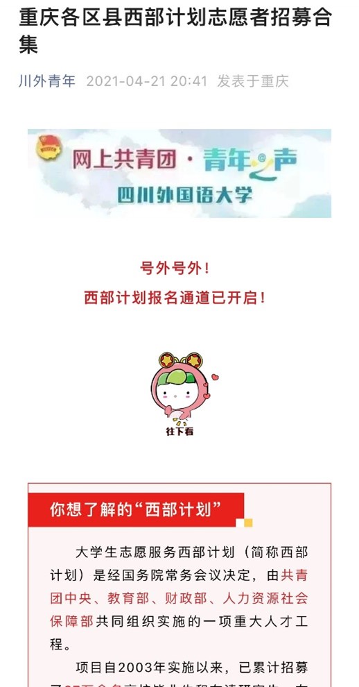 2021年,我校认真贯彻落实教育部、团中央有关文件精神,坚持完善工作体系、严格工作标准、强化工作保障,通过校内通知、新媒体矩阵、宣讲会等多种形式广泛开展招募宣讲。