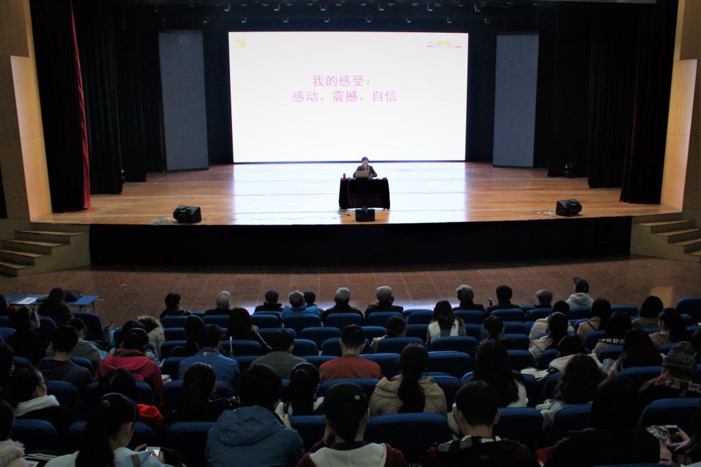 为深入学习贯彻党的十九大精神,12月1日下午,党委副书记张艳在学校东区大礼堂为中文系、国际商学院、日语系、教育学院、俄语系的学生进行十九大精神宣讲。她重点围绕党的十九大报告的主要内容、青年在党的十九大精神指引下如何进一步增强责任和使命、我们未来应该如何做三个方面做了深入浅出的讲解,并对青年一代寄予了殷切希望。离休党支部老党员、党群直属党支部党员也到场所认真听取了本次宣讲。