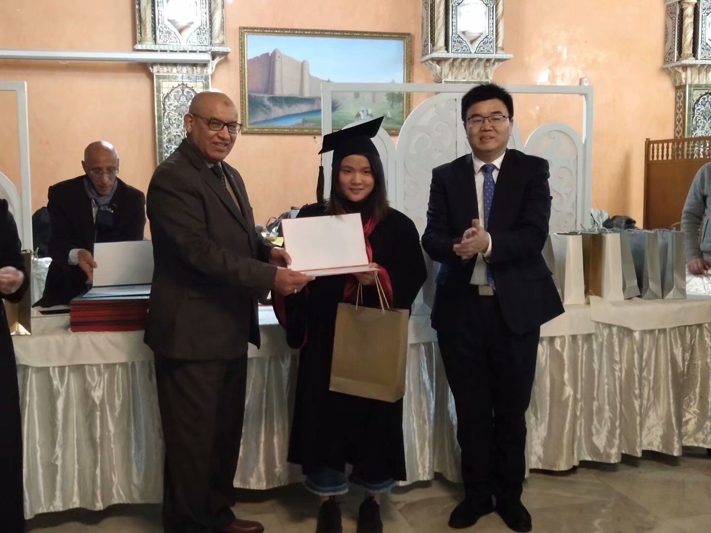 卡比尔校长与董洪川副校长一同为优秀学生颁发毕业证书