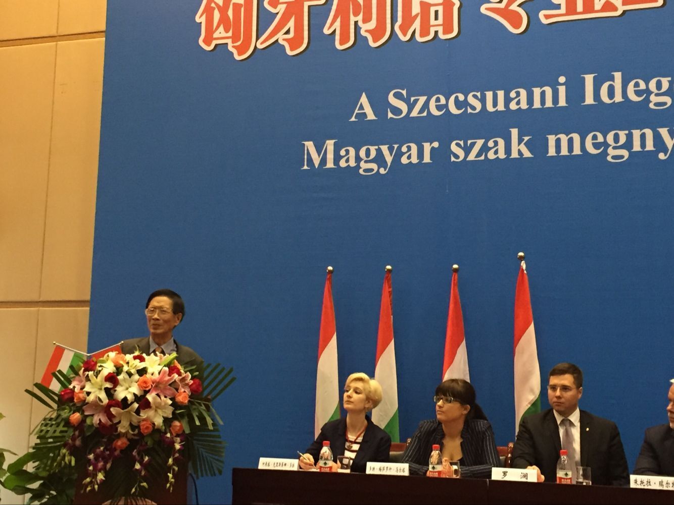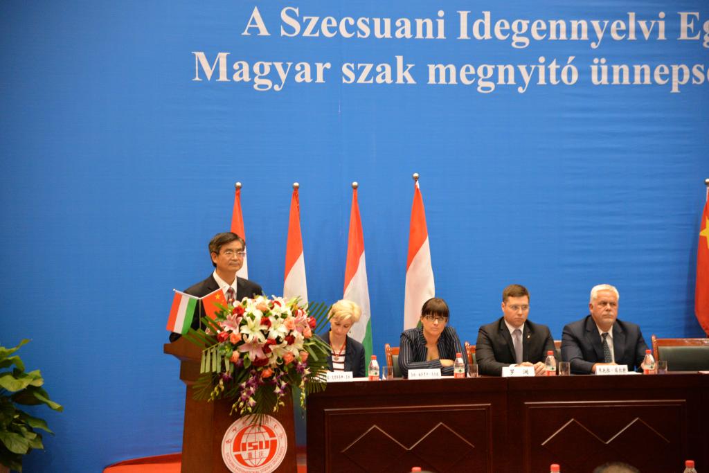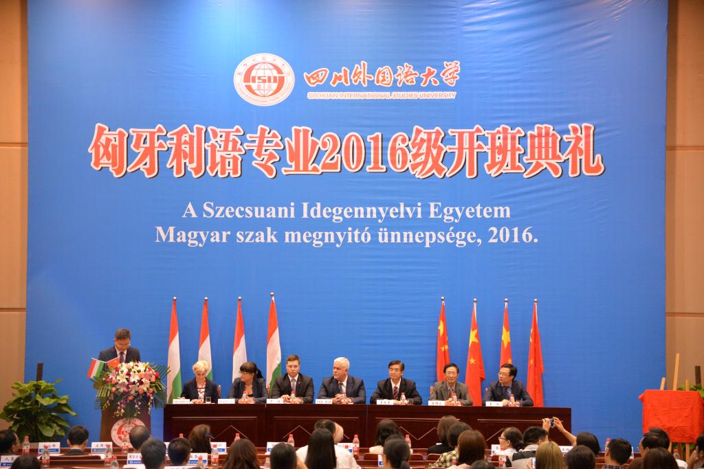 匈牙利外交外经部副国务秘书朱托拉•瑞尔特先生、匈牙利驻重庆总领事馆总领事罗澜先生、匈牙利外交外经部中国司司长多特•梅萨罗什•马尔塔女士、匈牙利外交外经部中国司工作人员柯来塔•克里斯蒂娜•多拉女士、匈牙利总领事馆领事办公室主任沙鸥儿女士及匈牙利驻重庆领事馆行政/项目官员王丽娟女士等外宾出席典礼。重庆市外事侨务办公室欧非处干部魏曦,重庆市教育委员会国际合作与交流处副处长李斌及中华人民共和国驻匈牙利前大使、我校杰出校友陈国焱,我校校长李克勇,郭坤余教授和匈牙利语外籍教师Eva Toth及相关部门负责人、教师代表及匈牙利语专业全体学生参加典礼。开班典礼由副校长王鲁男主持。