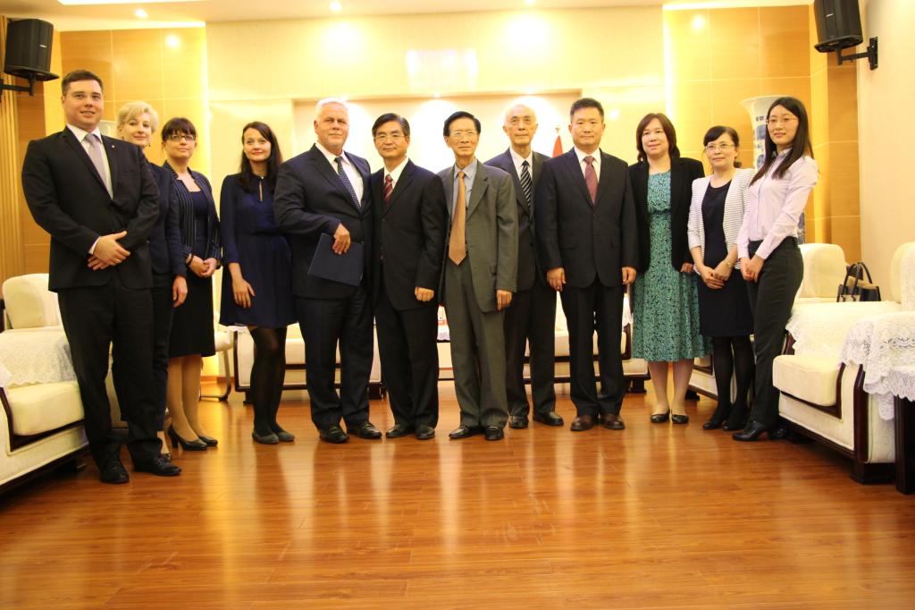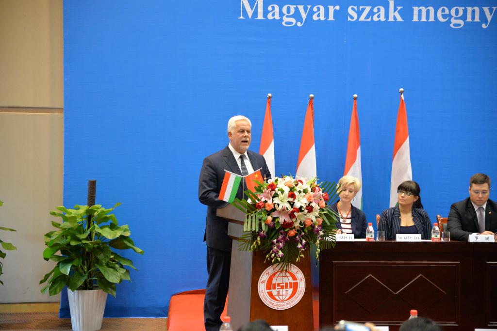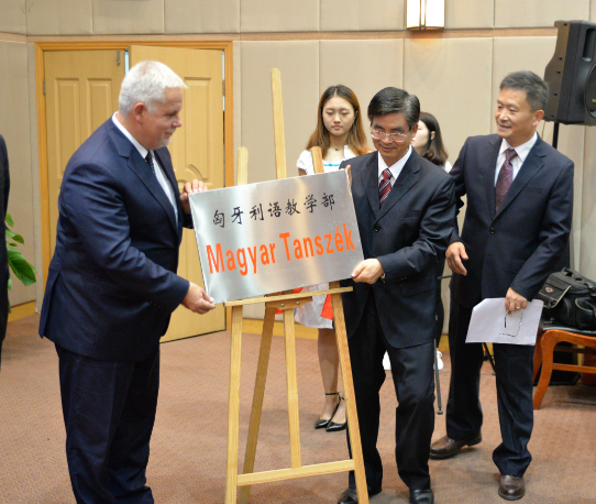 “我相信这十位匈牙利语专业的学生未来能够成为中匈两国之间的友好使节,并为促进世界各国的友好交往发挥作用。”朱托拉•瑞尔特先生在致辞中表达了参加开班典礼的激动之情,同时充分肯定了我校为创办匈牙利语专业付出的艰辛和努力。他表示,匈牙利共有12所大学开设中文专业,与中国有密切交流。匈牙利政府的向东开放政策与中国的“一带一路”的倡议不谋而合,罗兰大学已经成立“一带一路”研究院,这对加深中匈两国间交流具有重要的促进意义。朱托拉•瑞尔特先生与李克勇校长共同为匈牙利语教学部揭牌,并将其授予承办该专业的国际关系学院。