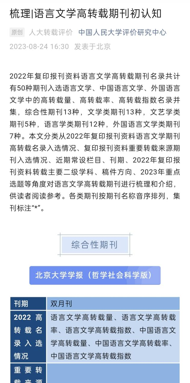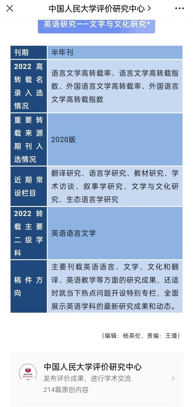 2023年8月24日,中国人民大学评价研究中心官方公众号发布2022年复印报刊资料语言文学高转载期刊名录,共计有50种期刊入选,从2022年复印报刊资料语言文学期刊高转载名录入选情况、复印报刊资料重要转载来源期刊入选情况、近期常设栏目、刊期、2022年复印报刊资料转载主要二级学科、稿件方向、2023年重点选题等角度对语言文学高转载期刊进行梳理和介绍。凭借语言文学高转载率、语言文学高转载指数、外国语言文学高转载率、外国语言文学高转载指数,《英语研究》成功入选2022年度外国文学类高转载期刊,2022转载主要二级学科为英语语言文学,2020版入选重要转载来源期刊。