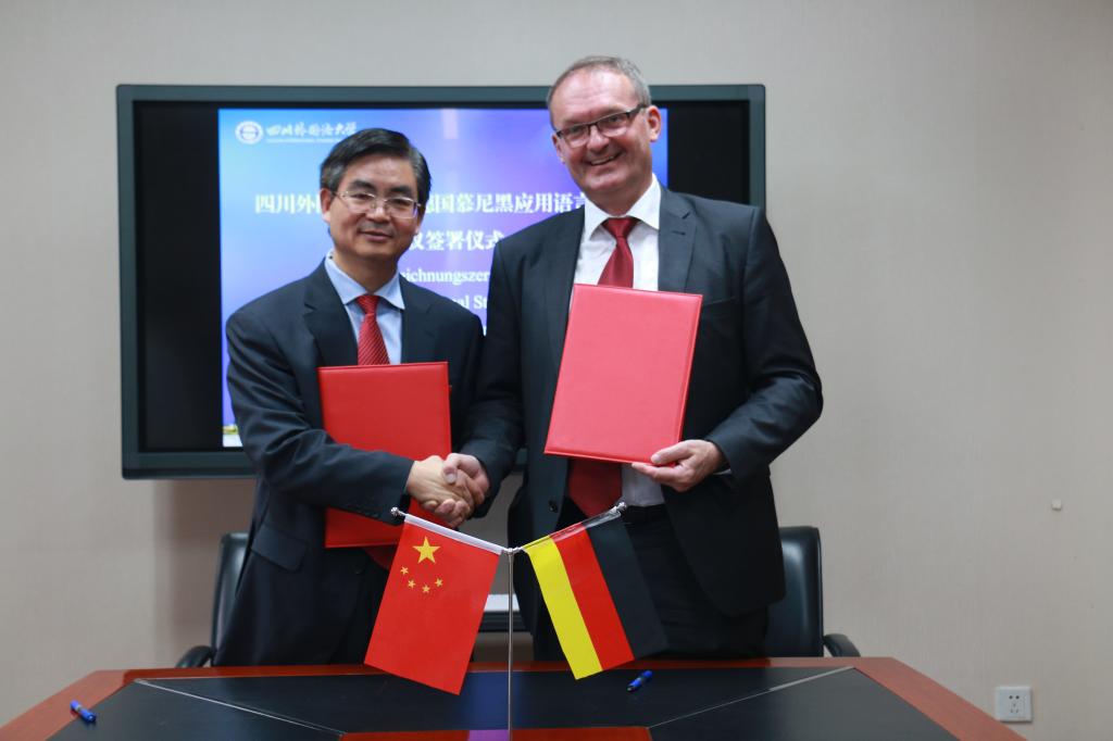 会晤中,李克勇校长首先致辞,对来宾的到访表示欢迎。他向来宾们详细介绍了我校的历史沿革、发展现状、师资队伍建设、对外合作交流及教学成果,并表达了对加强两校师生及科研交流合作的希望。随后,菲利克斯·迈耶尔校长致辞,对我校的热情接待表示感谢。在介绍了慕尼黑应用语言大学及其中德文翻译专业的成立背景、学校的发展情况和发展方向后,迈耶尔校长表示在川外感受到了良好的氛围,并表达了与我校加强合作的强烈意愿。双方还就各自的教育教学、人才培养等工作展开深入交流。最后,双方进行两校合作交流协议签署仪式,并互赠送礼品、合影留念。