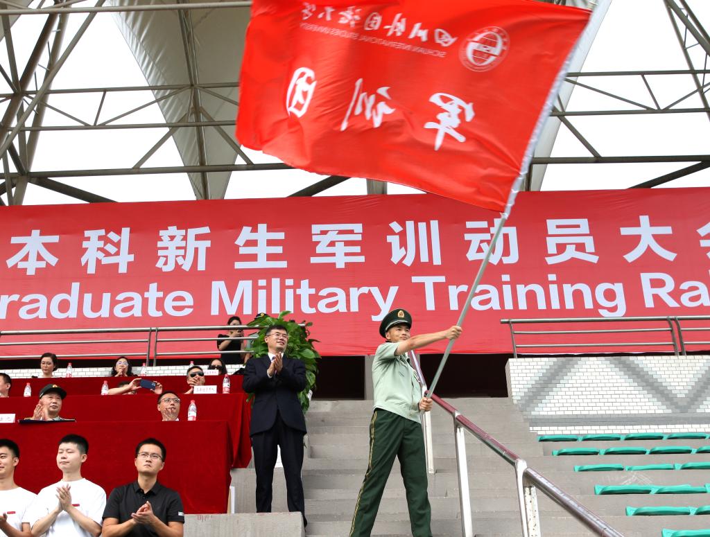 邹渝向军训团授“四川外国语大学学生军训团”团旗,大会在四川外国语大学校歌中结束。2021级新同学将在为期半个月的军训中锤炼意志,开启大学生活新篇章!