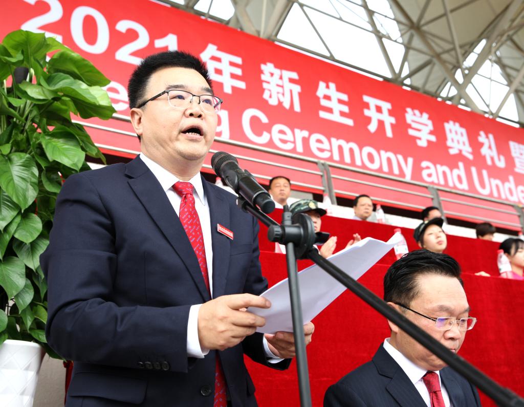 研究生新生代表,英语学院2021级博士生杨玉顺在发言中表示,作为博士研究生,主要任务是培养学术创新能力。川外为学子们提供了良好的学术环境,一批批学者带领着学子走在学术的最前沿。他寄语本科新生,要好好规划学习生活,在火热的青春中放飞人生梦想,在拼搏的青春中成就事业华章。