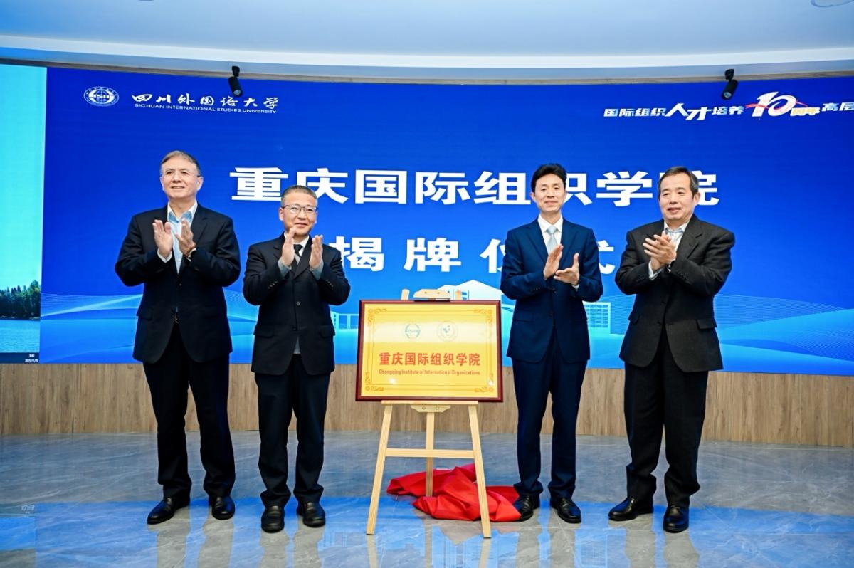随后,刘嗣方、周毅、孙树忠、薛玉雪共同为重庆国际组织学院揭牌。重庆国际组织学院的成立,标志着四川外国语大学国际组织人才培养制度设计、平台搭建和机制创新进入了新阶段,标志着学校在对接国家重大战略、服务重庆打造内陆开放综合枢纽、助力重庆建设中西部国际交往中心中又迈出关键一步。