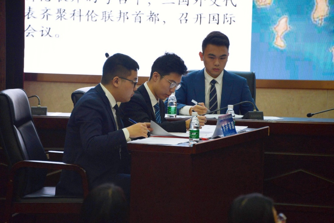 在公布初赛名次后,我校代表队收到了决赛议题。在准备时间短暂,所代表国家实力较弱的情况下,代表队成员们深入研读谈判材料,具有针对性地搜寻相关资料,提前制定谈判策略并草拟协议,积极地为第二天一早的决赛做准备。在决赛赛场上,代表队成员们秉持着“站稳立场,守住底线,积极争取”的理念,一次又一次地为争取国家利益发声。比赛结束后,我校代表队成员以准确的外交表达,扎实的外交知识基础和规范的外交外事礼仪,赢得了在场的评委老师们,主席团和观众的一致好评。