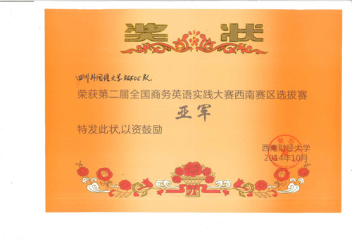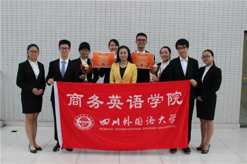 10月18日,全国商务英语实践大赛(西南赛区选拔赛)在西南财经大学举行,由四川外国语大学商务英语学院2012级鞠舒同、张荣臻、陈玖阳、杨雪儿、陈渭中、王梦琪、曹宇慧、李珊组成的befoc团队在比赛中获得亚军,其中,2012级的张荣臻同学凭借出色的英语口语和舞台表现,荣获“最佳个人风采”奖。