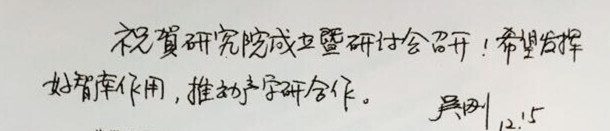 重庆市人民政府副市长吴刚专程发来贺信,祝贺研究院成立暨研讨会召开!希望发挥好智库作用,推动产学研合作。