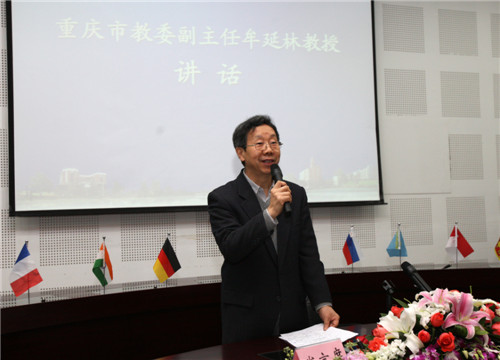 重庆市教育委员会副主任牟延林讲话,他对重庆国际战略研究院的成立表示祝贺,对其未来发展表示期待。讲话中,他为我校的发展建言献策,提供了三点建议:一是做好在“一带一路”背景下的战略、战局、战术的“三准备”;二是做好传统语言教学型转到融入产业格局的大融合、传统的纯理论研究转到经济主战场的选择以及重视非通用语种的“三转型”;三是做好对教学理念、方向、制度的规划,对专业、课程、师资、学生成长的规划以及学校今后的发展规划等“三规划”。