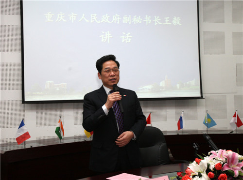 重庆市人民政府副秘书长王毅讲话,在表达对重庆国际战略研究院成立祝贺的同时,他表示召开此次研讨会和成立研究院体现了川外在支持“一带一路”战略上所显现出的眼光、远见和底气。他强调了重庆在“一带一路”战略中的重要地位,希望在今后的发展过程中能更好地抓住机遇和挑战,将长江经济带和“一带一路”战略统筹发展,进一步促进“一带一路”的繁荣以及更好地凸显重庆在国家中的战略地位。