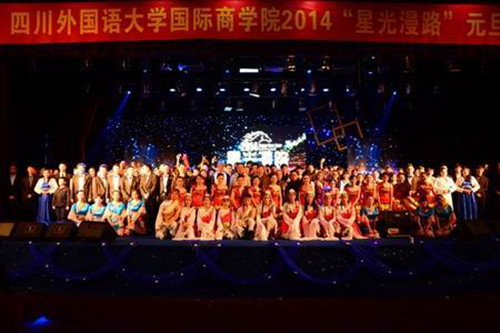 新年的钟声即将敲响,在这辞旧迎新之际,国际商学院2014年“星光漫路”元旦晚会于12月16日在东区大礼堂隆重举行。副校长乐勇,档案室主任周正容,党政办副主任淡修安,财务处副处长李丽萍,离退休处副处长周福兰,人事处副处长王定军、彭程,国际合作与交流处副处长陈功,国际商学院院长杨柏、党总支书记高绍邦、副院长李训、副院长李江、副院长jason等作为嘉宾莅临晚会现场;同时,各兄弟院系团干部、国际商学院教师们也受邀前来观看晚会。