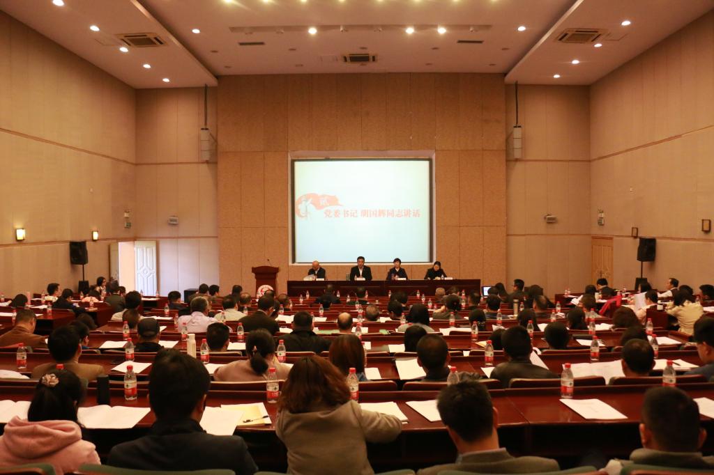 明国辉就本次培训宗旨与目标作讲话。他围绕“学懂”,“弄通”与“做实”三大主题阐述培训目的,着重强调参训的党员干部要对十九大精神作发散理解和延伸拓展,在十九大报告的“全文”与“原文”阅读上下功夫,做到以十九大报告为主体,全面学习习近平新时代中国特色社会主义思想。他要求与会人员将学习成果落实到实际工作中,将十九大精神与全面从严治党的党风建设,意识形态的加强改进融会贯通于教学实践与学科建设中。最后,明国辉要求学校党政领导干部都要加强党建意识,提升辩证思维能力,在学习实践中提高理论水平。