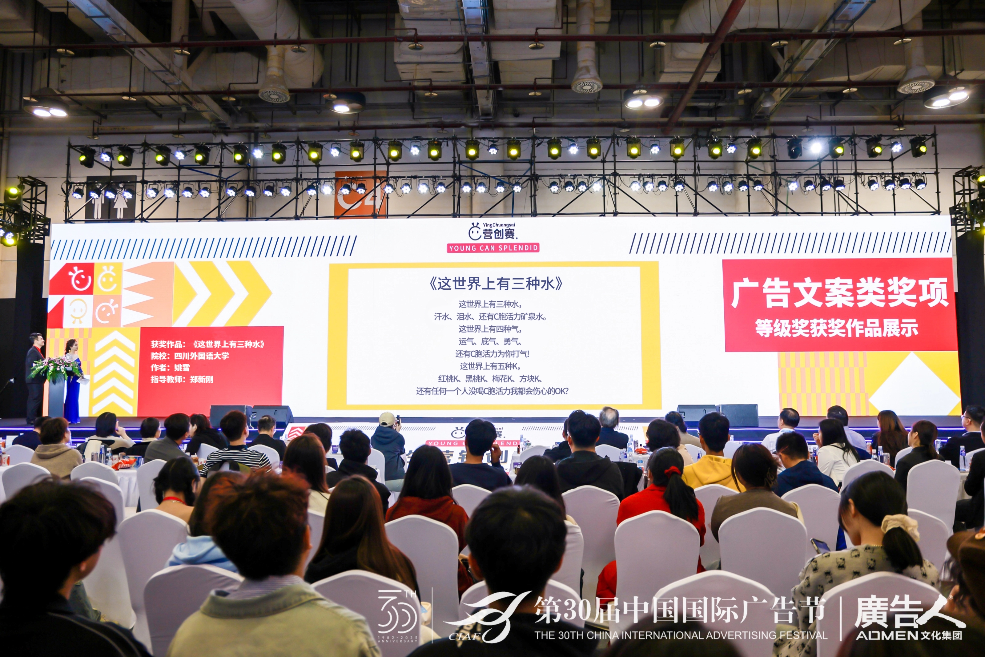 2023年11月16-19日,第30届中国国际广告节在厦门举行。期间,国内影响力最大的大学生共创赛事之一——中国大学生营销创意创业大赛(以下简称“营创赛”)于19日上午在厦门会议展览中心举行荣誉颁发盛典。我校新闻传播学院广告学专业姚雪同学的广告文案作品《这世界上有三种水》斩获中国大学生营销创意创业大赛C胞活力命题银级奖和3000元奖金,并受邀前往盛典现场领取奖励。