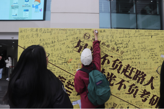 此次活动主要分为两个环节,一是邀请考研同学在心愿墙上写下自己美好的祝愿,以期表达对他们的鼓励和祝福;二是邀请考研同学参与“缓解压力”有奖小游戏,包括夹珠子、贴鼻子等新颖、有趣味、具有挑战性的游戏,帮助他们减轻心理压力,放松心态,增强信心,能够以更好的精神面貌迎接考试。