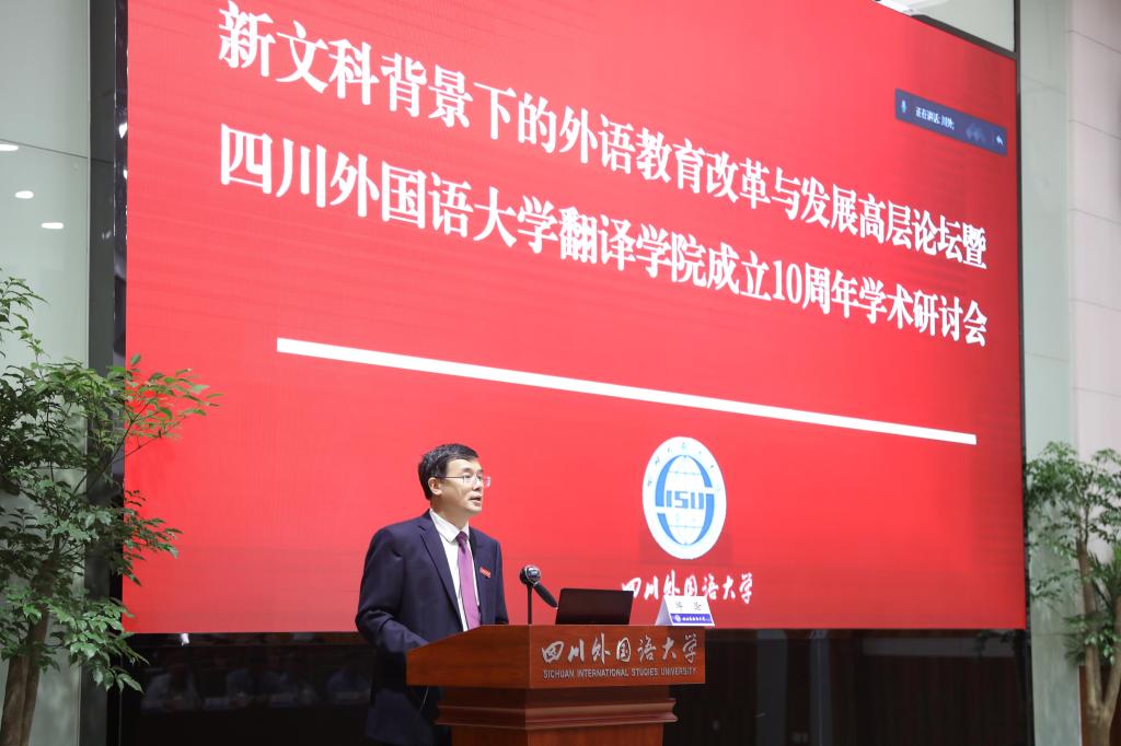 2020年6月19日—20日,“新文科背景下的外语教育改革与发展”高层论坛暨四川外国语大学翻译学院成立十周年学术研讨会在我校东区宏文楼国际报告厅成功举行。来自浙江大学、南京大学、复旦大学、上海交通大学、中国人民大学、山东大学、中国翻译研究院、北京外国语大学、上海外国语大学、广东外语外贸大学、中国政法大学、华东师范大学、西南大学、山东师范大学、战略支援部队信息工程大学洛阳校区、四川外国语大学等国内近20所高校的专家学者,100余名校内外师生出席了本次研讨会。