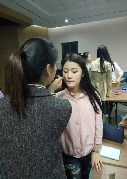 家庭经济困难的学生不仅需要物质上的资助,同时也需要更多出彩的机会。基于此,学校专门为学生们开设了美妆课,希望贫困学生能借此提高自信、提升素质。下图为老师给学生们示范如何化妆。