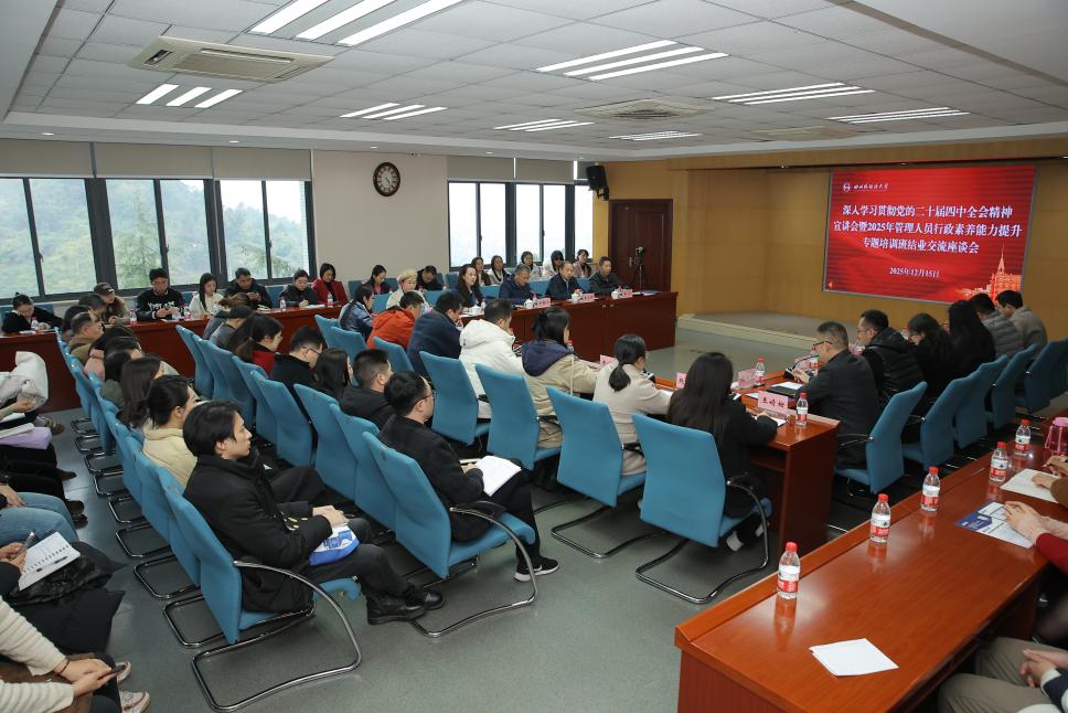 12月15日,学校2025年管理人员行政素养能力提升专题培训班结业交流座谈会在立德楼C517会议室召开,党委书记刘嗣方出席会议并讲话,副校长张北坪参加座谈会。