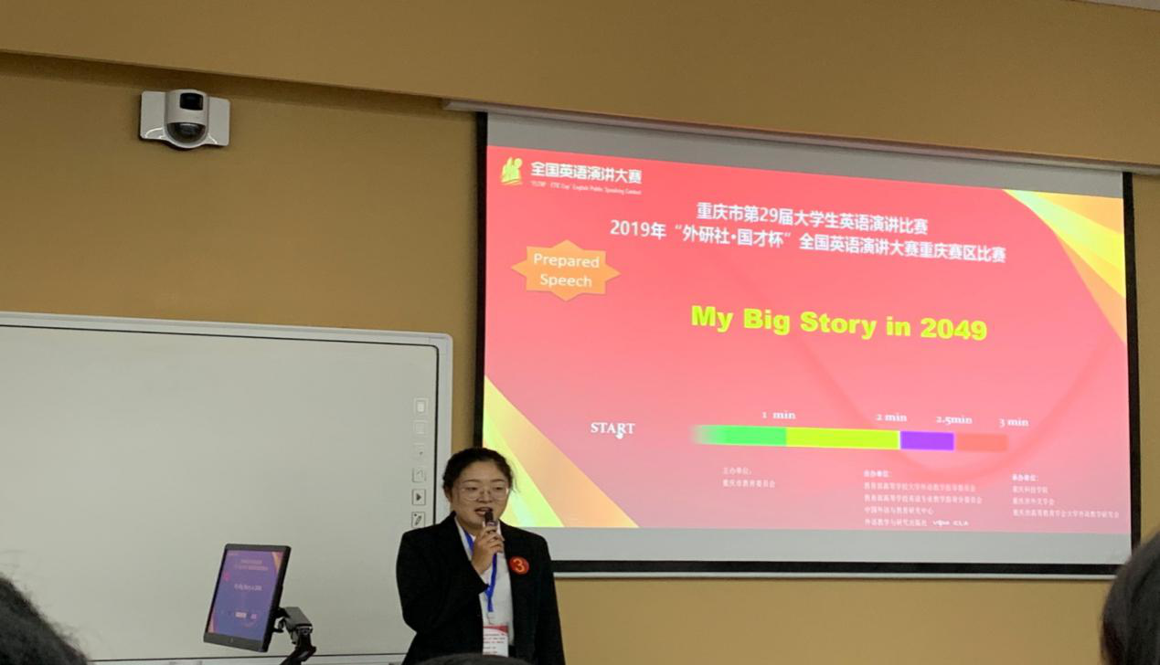 2019年10月26日,重庆市第二十九届大学生英语演讲、写作、阅读比赛暨2019年“外研社·国才杯”全国英语演讲、写作、阅读大赛重庆赛区比赛在重庆科技学院举行。我校选派了13名选手参加此次比赛,取得了优异的成绩。在复赛中,获得重庆市第二十九届大学生英语演讲比赛暨2019年“外研社•国才杯”全国英语演讲大赛重庆赛区特等奖2项,一等奖3项;获得写作大赛一等奖和二等奖各2项;获得阅读大赛特等奖1项,一等奖1项以及二等奖2项;其中,获得特等奖的3名选手将代表重庆市参加全国决赛。